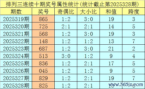上期总结:成列三第2025328期奖号:825。类型:组六,奇偶方法:偶偶奇,大小方法:大小大,和值:15,跨度:6。